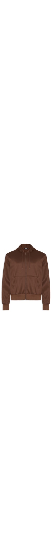 O casaco marrom é confeccionado em moletom flanelado sem elasticidade. A peça solta ao corpo possui capuz com cordão embutido para ajuste, mangas longas com ajuste nos punhos, bolsos frontais e fechamento frontal por zíper.