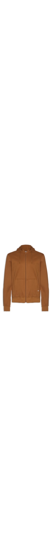 O casaco marrom é confeccionado em moletom flanelado sem elasticidade. A peça solta ao corpo possui capuz com cordão embutido para ajuste, mangas longas com ajuste nos punhos, bolsos frontais com tag da marca bordada e fechamento frontal por zíper.