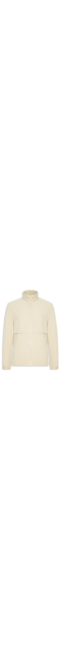 O casaco bege é confeccionado em nylon sem elasticidade. A peça solta ao corpo possui gola alta com capuz embutido e fechamento por zíper, mangas longas com elástico embutido nos punhos, bolsos frontais embutidos com fechamento por botão de pressão, vista sobreposta na parte frontal e posterior e fechamento frontal por zíper.