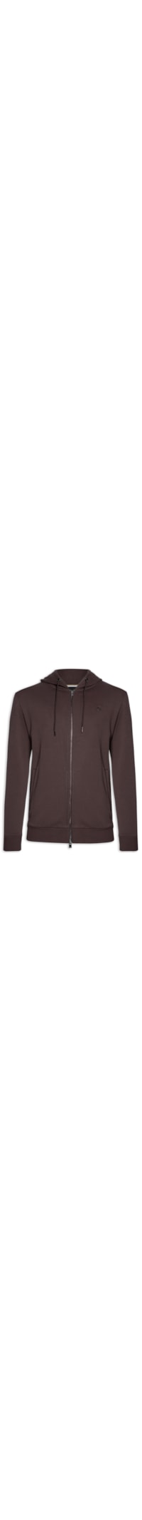 O casaco marrom é confeccionado em moletom de média elasticidade. A peça solta ao corpo, possui capuz com cordão embutido para amarração frontal, mangas longas com punho afunilado, tag da marca aplicada na altura do tórax, bolsos frontais embutidos, tag da marca aplicada na lateral, acabamento canelado e fechamento frontal por zíper metálico.