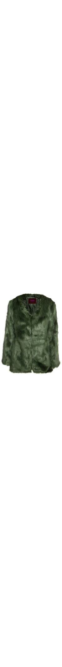 O casaco verde é confeccionado em tecido sintético revestido por fake fur*. A peça possui gola careca, decote V, ombros regulares, manga longa, caimento reto, forro estampado com a logo da marca, fechamento em colchetes na parte frontal, comprimento regular, shape solto.