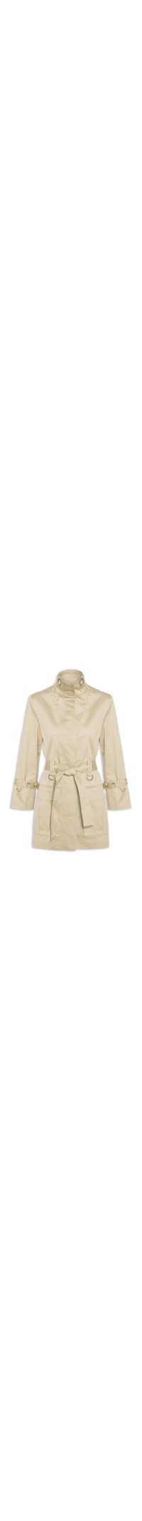 O casaco Bege é confeccionado em tecido plano estruturado, sem elasticidade. A peça possui gola alta com tira e fivela para ajuste, mangas longas com faixas para ajuste, ombros levemente estruturados, bolsos frontais utilitários com aba, passantes aplicados com argolas metálicas, faixa para amarração na cintura, comprimento alongado, forro interno listrado e fechamento frontal por botões embutidos.