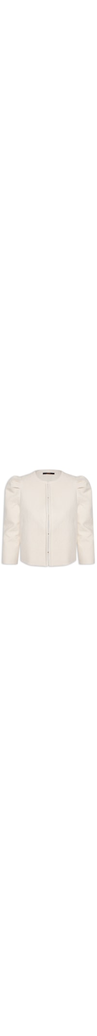 O casaqueto bege é confeccionado em jacquard sem elasticidade. A peça solta ao corpo possui decote redondo, mangas 3/4 com pregas na altura dos ombros, recorte posterior, bolsos frontais decorativos, forro, comprimento cropped* e fechamento frontal por colchetes.