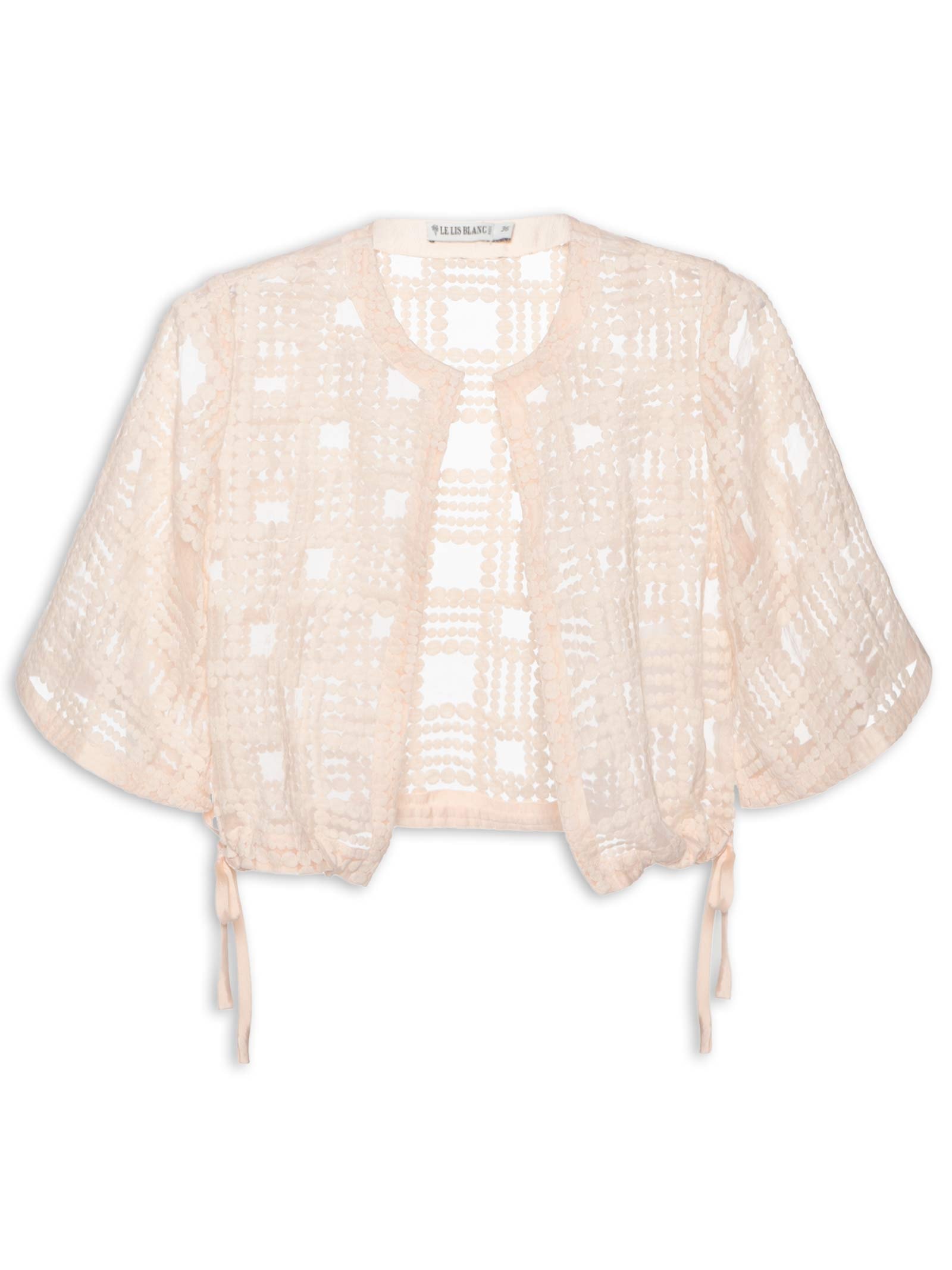 O casaqueto bege é confeccionado em tecido leve transparente sem elasticidade. A peça solta ao corpo possui decote redondo, mangas curtas, aplicação de bordados circulares por toda a peça, aplicação de cordão embutido na barra para regulagem.