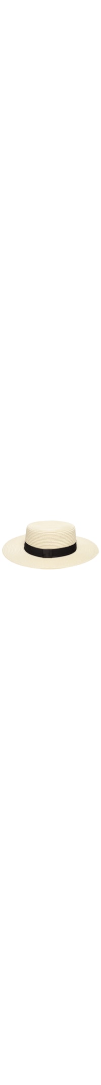 O chapéu bege é produzido em palha. A peça possui copa reta, aba larga e faixa na cor preta aplicada na base da copa.