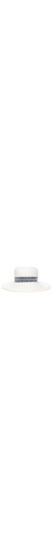 O chapéu off white é produzido em palha. A peça possui copa arredondada, aba larga e faixa na cor azul marinho com detalhes em cor contrastante aplicada na copa.