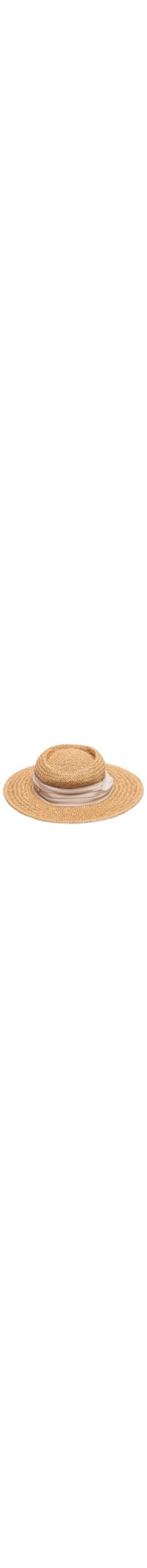 O chapéu bege é produzido em ráfia. A peça possui tamanho grande, aba reta, tira larga com drapeado e nome metálico da marca aplicado na parte superior em cor contrastante, tira de gorgurão na cor preta aplicada na parte interna e efeito trançado.