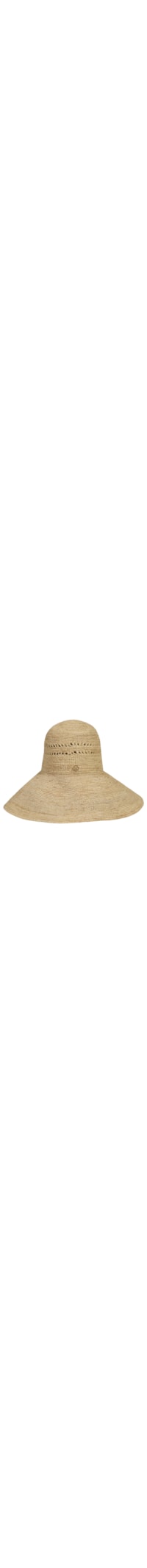 O chapéu bege é confeccionado em ráfia. A peça possui aba larga, detalhe vazado na parte superior e tag da marca aplicada na parte interna.