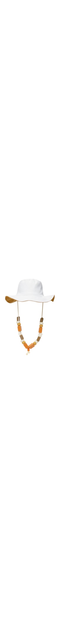 O chapéu branco é produzido em sarja. A peça possui aba larga, forro na cor marrom e cordão alongado com aplicações em resina com cores contrastantes.