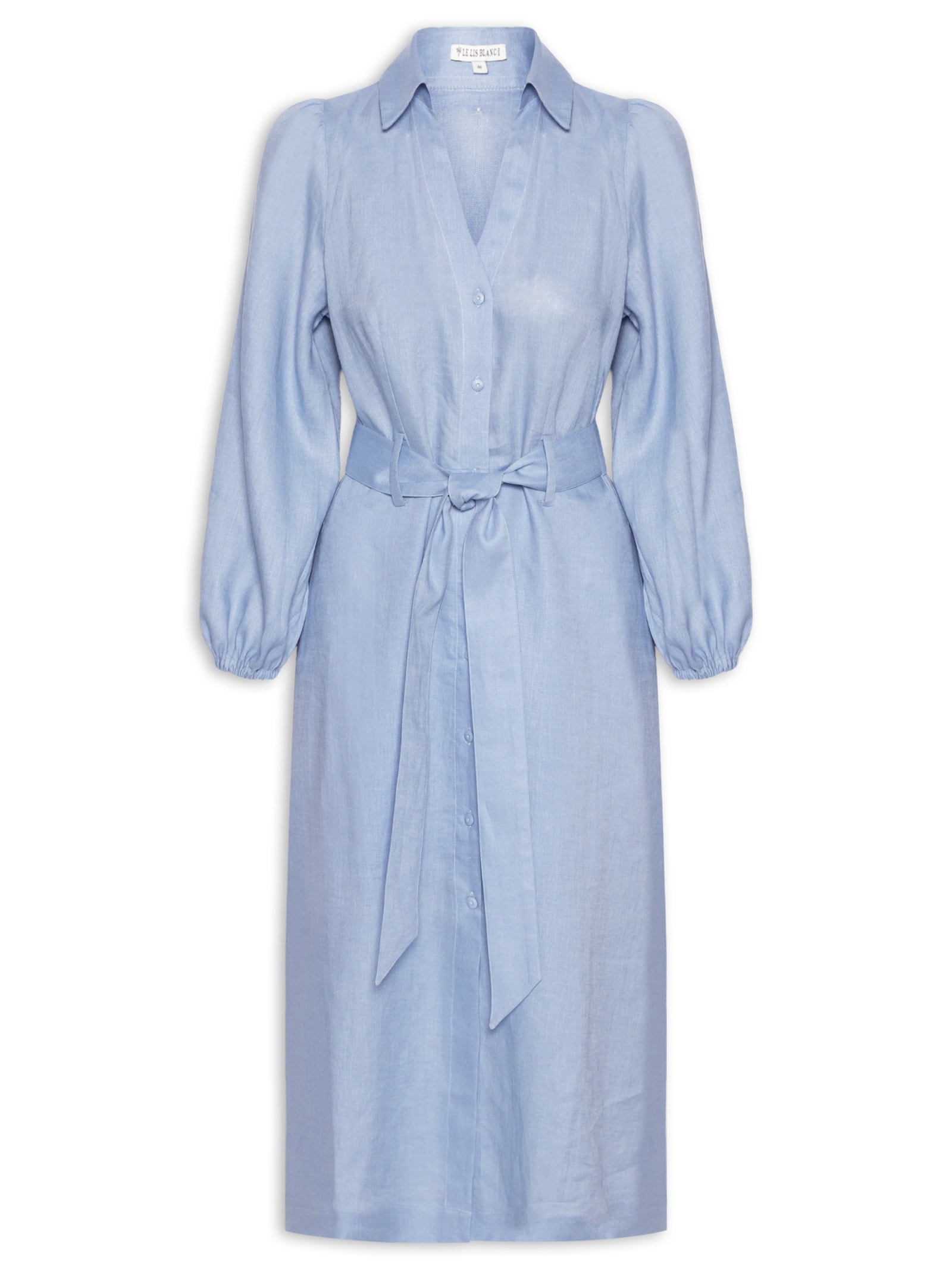 A chemise azul é confeccionada em linho sem elasticidade. A peça solta ao corpo possui colarinho clássico com recorte em V, longas com elástico embutido nos punhos, passantes aplicados na cintura, leve transparência, comprimento midi e fechamento frontal por botões.