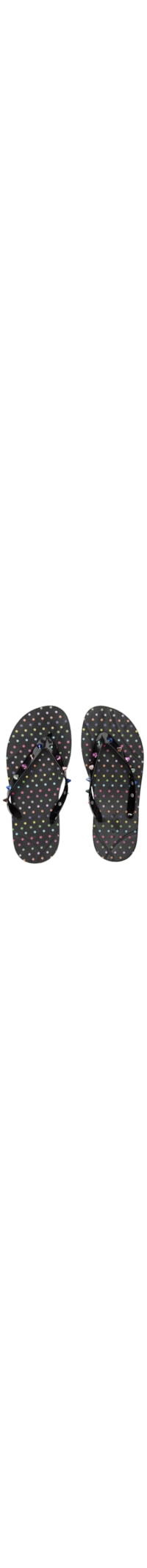 O chinelo preto é produzido em borracha. A peça possui bico arredondado, tiras frontal com aplicação de spike em cores contrastantes, palmilha macia com detalhe em relevo, estampa de poá em cores contrastantes e solado emborrachado.
