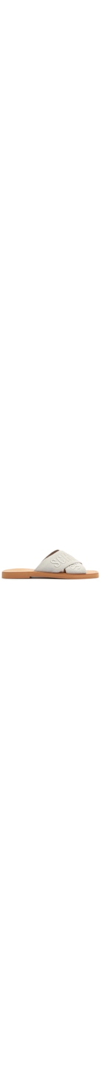 O chinelo cinza é produzido em gorgurão. A peça de modelo slide, possui bico quadrado, tiras largas frontais com nome da marca bordado, palmilha com nome da marca em baixo-relevo e detalhe pespontado, salto flat e solado laqueado.