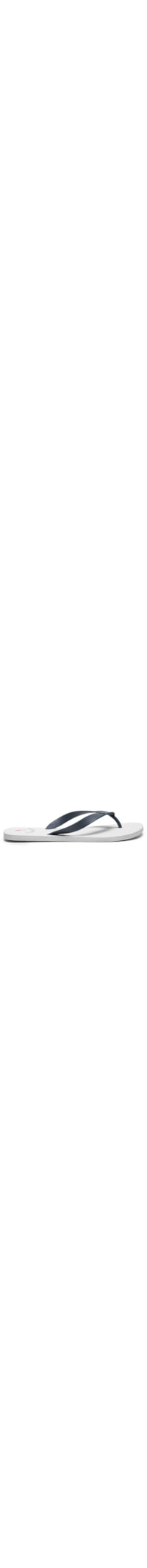 O chinelo branco é produzido em EVA. A peça possui bico arredondado, tiras médias emborrachadas frontais com logo da marca em relevo, palmilha macia em EVA com monograma da marca em relevo e logo da marca com nome estampado em cores contrastantes e solado emborrachado com superfície texturizada.