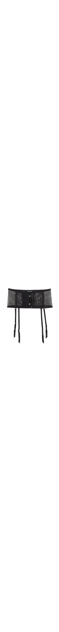 Cinta liga em renda e tule com efeito de rede, com um sofisticado efeito cruzado na parte central, adornado por delicados acessórios dourados.