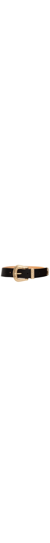 O cinto preto é produzido em couro. A peça possui espessura média, fivela e ponteira de metal com detalhe em relevo, perfuros, acabamento pespontado e fechamento frontal por fivela ajustável.