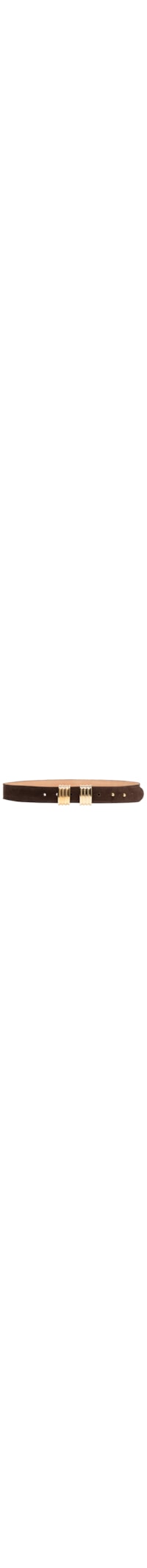 O cinto marrom é produzido por camurça. A peça possui espessura média, oito perfuros para ajuste, nome da marca timbrado aplicado na parte interna e fechamento por passantes fixos metalizados.