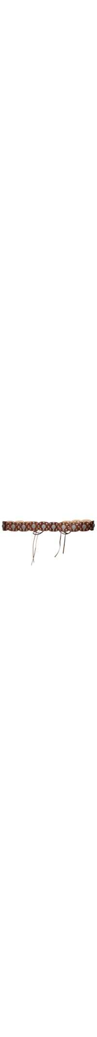 O cinto marrom é produzido em couro. A peça possui espessura média, recortes, tachas metálicas com detalhe central de gravura, franjas finas alongadas e fechamento posterior por amarração.