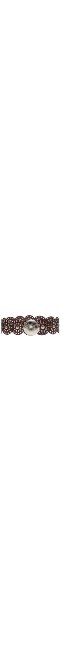 O cinto marrom é produzido por material sintético. A peça possui espessura grossa, círculos com ilhóses e aplicações metálicas vazadas e fechamento por fivela metalizada.