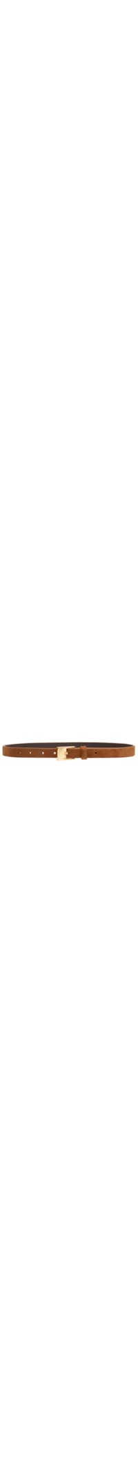 O cinto marrom é produzido em camurça. A peça possui espessura fina, passante fixo, perfuros e fechamento frontal por fivela metálica regulável.