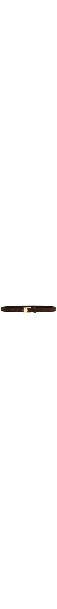 O cinto marrom é produzido em camurça. A peça possui espessura fina, passante fixo, perfuros e fechamento frontal por fivela metálica regulável.