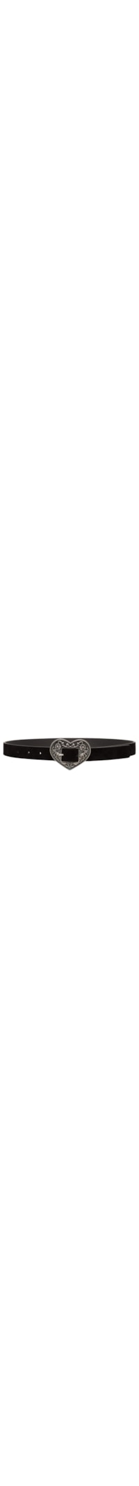 O cinto preto é produzido em couro misto. A peça possui espessura fina, 7 perfuros, nome da marca gravado na parte interna e fechamento por fivela em formato de coração.