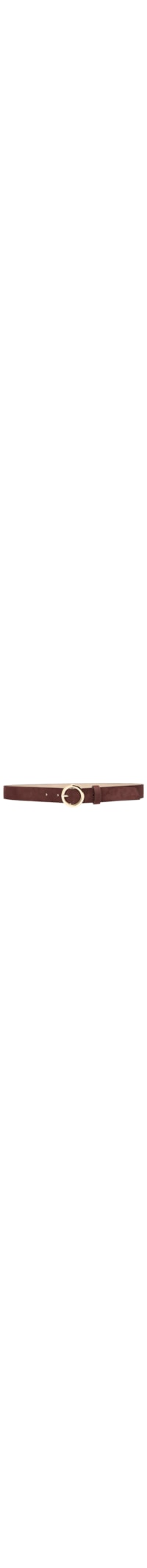 O cinto marrom é produzido em camurça. A peça possui espessura média, passante, 5 perfuros, fivela metálica arredondada e com acabamento polido e fechamento frontal por fivela metálica regulável.