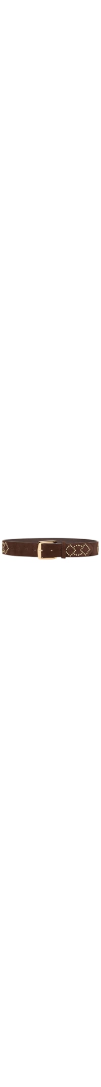 O cinto marrom é produzido em camurça. A peça possui espessura média, passantes fixo, 7 perfuros, aplicação de tachas metalizados e fechamento frontal por fivela regulável metalizada.