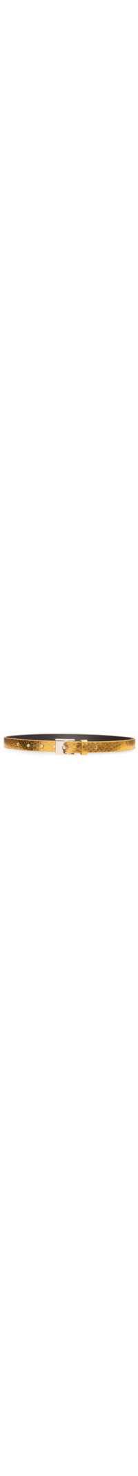 O cinto dourado é produzido em material sintético com superfície texturizada. A peça possui espessura fina, nome da marca metalizado aplicado, passante fixo, sete perfuros para ajuste e fechamento frontal por fivela metalizada.