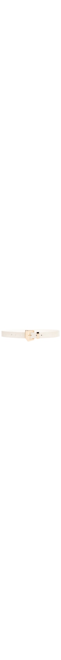 O cinto off white é produzido em poliuretano com superfície texturizada. A peça possui espessura média, passante fixo metálico, sete perfuros para ajuste e fechamento frontal por fivela metálica assimétrica.