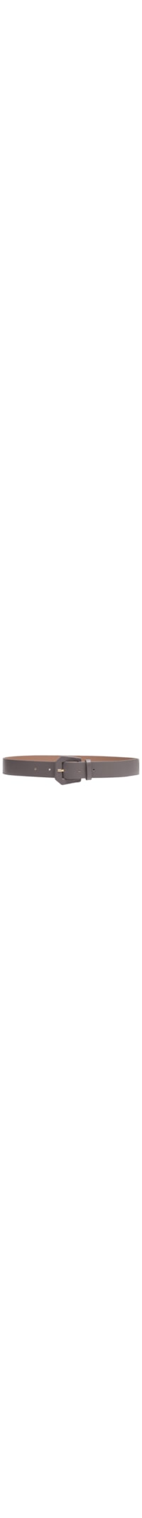 O cinto cinza é produzido em couro. A peça possui espessura média, perfuros para ajuste, passante próximo à fivela, fechamento por fivela geométrica encapada em couro.
