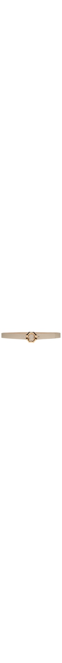 O cinto bege é produzido em couro. A peça possui espessura fina, 5 perfuros e fechamento por fivela metalizada regulável com formato orgânico.