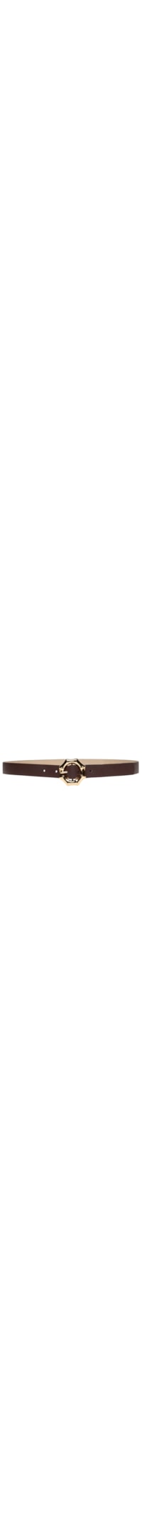 O cinto marrom é produzido em couro. A peça possui espessura fina, 5 perfuros e fechamento por fivela metalizada regulável com formato orgânico.