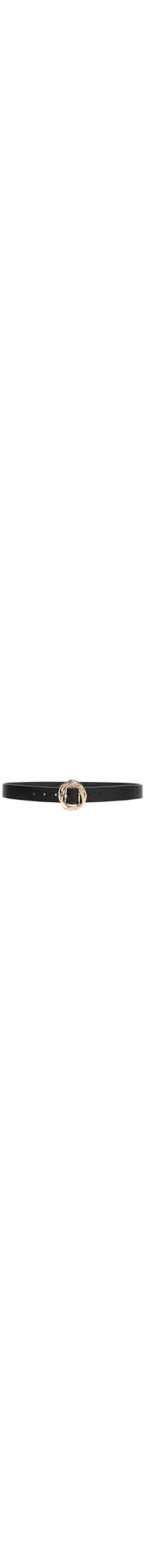 O cinto preto é produzido em material sintético com superfície texturizada. A peça possui espessura média, perfuros para regulagem e fechamento frontal por fivela metálica em formato orgânico com recortes vazados e detalhes em relevo.