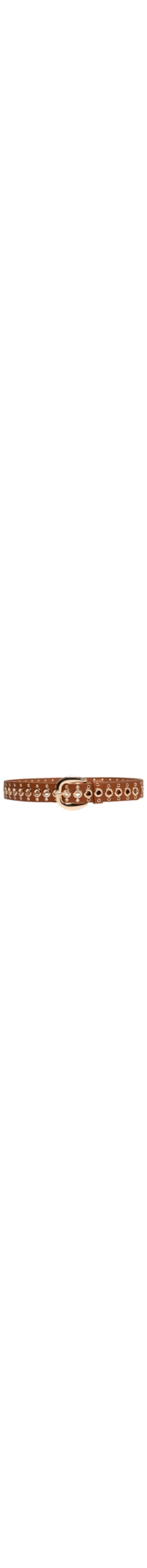O cinto marrom é produzido em material sintético.A peça possui espessura média, aplicação de ilhoses e tachas metálicas com formato redondo com perfuros e fechamento frontal por fivela metálica.