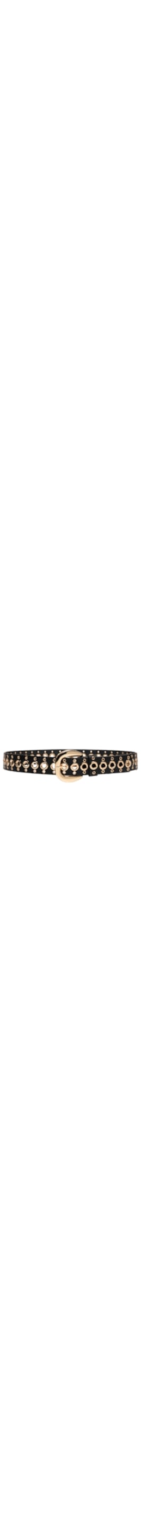 O cinto preto é produzido em material sintético.A peça possui espessura média, aplicação de ilhoses e tachas metálicas com formato redondo com perfuros e fechamento frontal por fivela metálica.