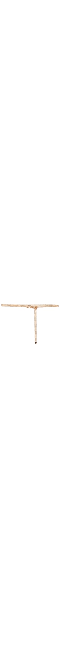 O cinto dourado é produzido em metal. A peça possui espessura fina, passante fixo, corrente dupla com elos entrelaçados, ponta assimétrica, acabamento polido e fechamento frontal por fivela metálica.