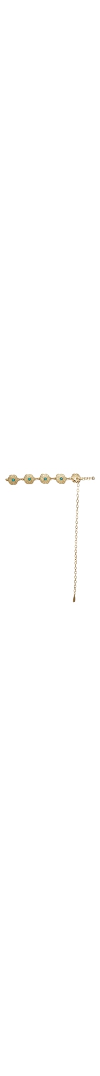 O cinto dourado é produzido em metal. A peça possui espessura média, moedas metálicas texturizadas com pedraria na cor turquesa aplicada ao meio, corrente alongada e fechamento por fecho lagosta.