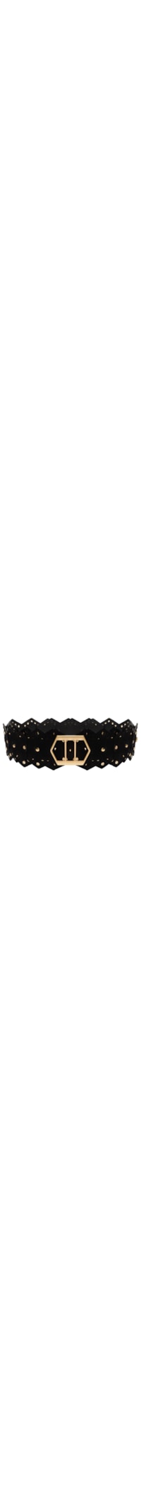 O cinto preto é produzido em camurça. A peça possui formato em recortes geométricos, espessura média, tachas metálicas em tamanhos diferentes aplicadas e fechamento frontal por fivela metálica em formato da logo da marca.