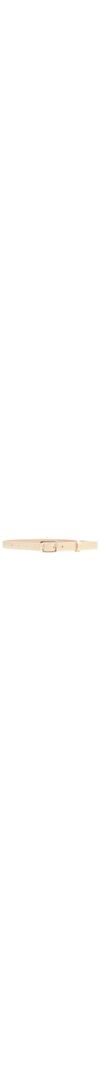 O cinto bege é produzido em couro. A peça possui espessura fina, 7 perfuros, passante e fechamento frontal por fivela metálica regulável e com formato retangular.