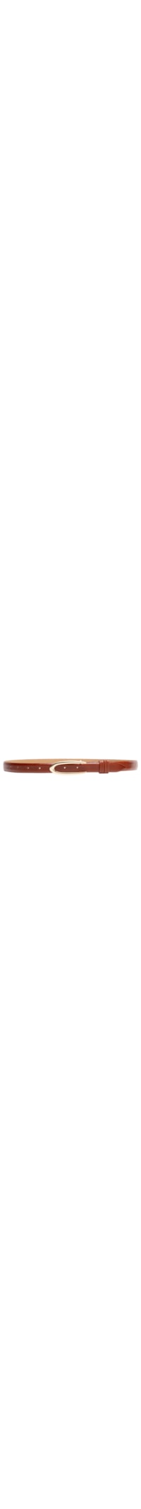 O cinto marrom é produzido por couro com superfície texturizada. A peça possui espessura fina, sete perfuros para ajuste, passantes fixos aplicados na ponteira e fechamento por fivela metalizada.