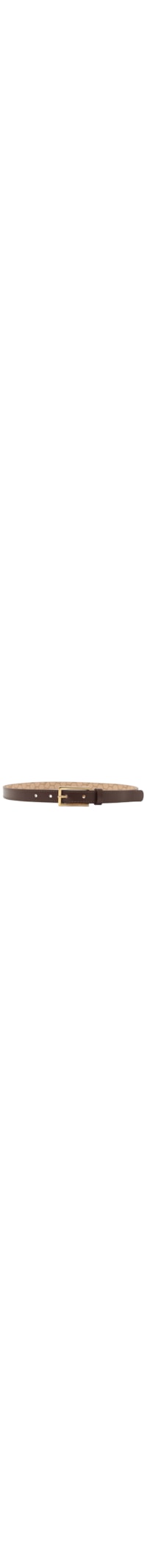 O cinto marrom é produzido em couro. A peça possui espessura fina, passante, perfuros e fechamento frontal por fivela metálica quadrada.