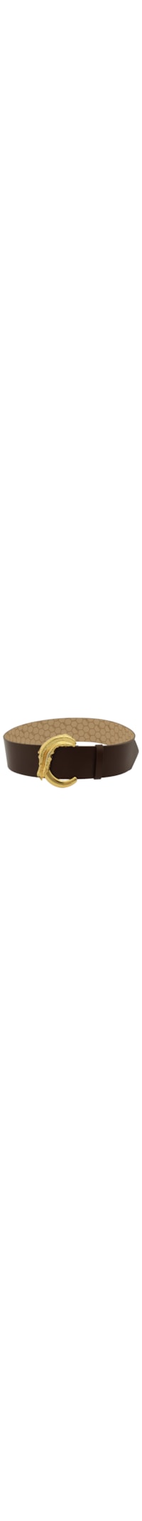 O cinto marrom é produzido em couro. A peça possui espessura média, passante fixo metalizado e fechamento frontal por fivela metalizada com formato figurativo de folhagem.