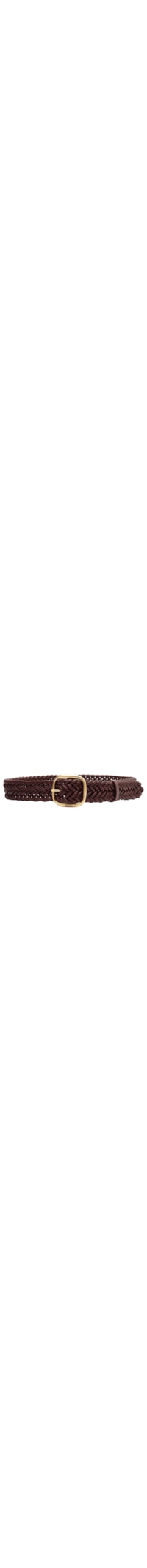 O cinto marrom produzido em couro com superfície em tressê. A peça possui espessura média, passante fixo e fechamento frontal por fivela metálica com regulagem.