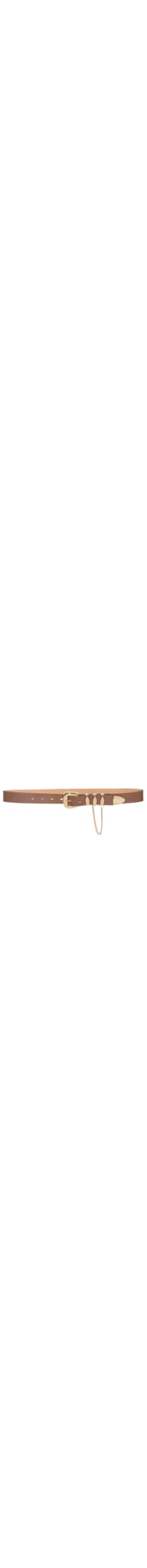 O cinto marrom é produzido em couro com superfície texturizada. A peça possui espessura média, sete perfuros para ajuste, ponteira metalizada, passantes fixos triplos metalizados com aplicação de corrente metalizada e fechamento frontal por fivela metalizada arredondada.