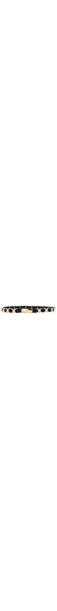 O cinto preto é confeccionado em elástico. A peça possui espessura fina, passantes metálicos móveis em formato cruzado com banho dourado e acabamento polido, fecho frontal por encaixe.