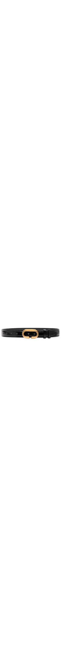 O cinto preto é produzido em couro. A peça possui tamanho médio, passante fixo duplo, perfuros para regulagem, acabamento envernizado e fechamento frontal por encaixe de fivela metálica em formato figurativo de elo com nome da marca gravado.