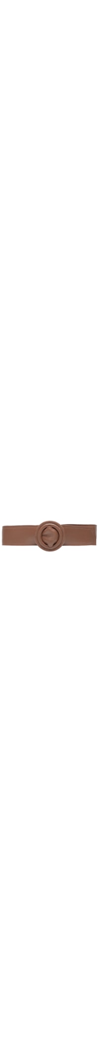 O cinto marrom é produzido em couro. A peça possui espessura larga e fechamento frontal por fivela arredondada forrada.