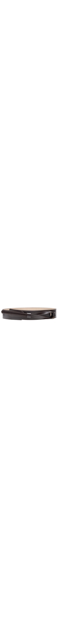 O cinto marrom é produzido em couro com superfície resinada. A peça possui espessura média, passantes fixos, tira fina alongada e fechamento frontal por encaixe.