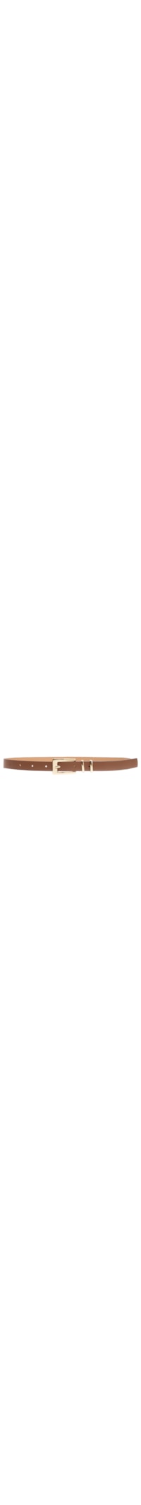 O cinto marrom é produzido em material sintético com superfície texturizada. A peça possui espessura fina, sete perfuros, passante fixo e fechamento frontal por fivela metálica regulável.