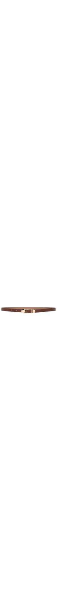 O cinto marrom é produzido em material sintético. A peça possui espessura fina, perfuros e fechamento por fivela alongada metálica de formato arredondado.